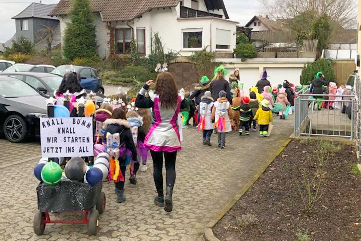 Mit lauter Musik und viel Helau machten sie auf sich aufmerksam und so warteten am Wegrand bereits viele Eltern, Großeltern, Familienangehörige und Freunde der Kita und warfen den Kindern Süßigkeiten zu. Auch unser Bürgermeister und seine liebe Frau Simone ließen es sich nicht nehmen, sich unter die Kinder zu mischen und sie mit einem Bonbonregen zu belohnen.