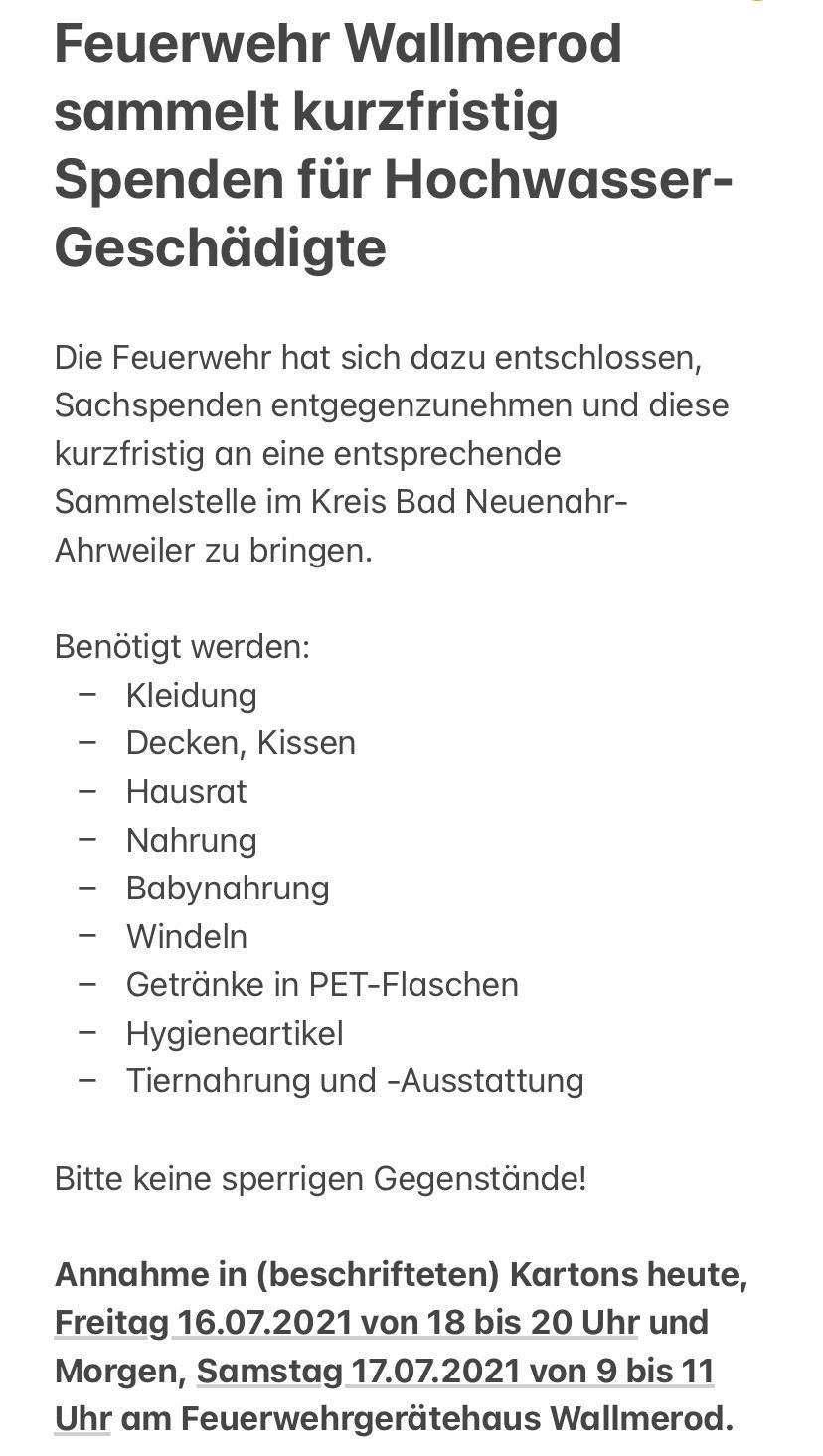 Nachfolgend der Aufruf der Feuerwehr, der über alle Plattformen ging und auch weit über Wallmerod hinaus eine riesige Resonanz fand. Die Aktion wurde am Samstag um 11 Uhr vorzeitig beendet, da alle Transportkapazitäten erschöpt waren.
