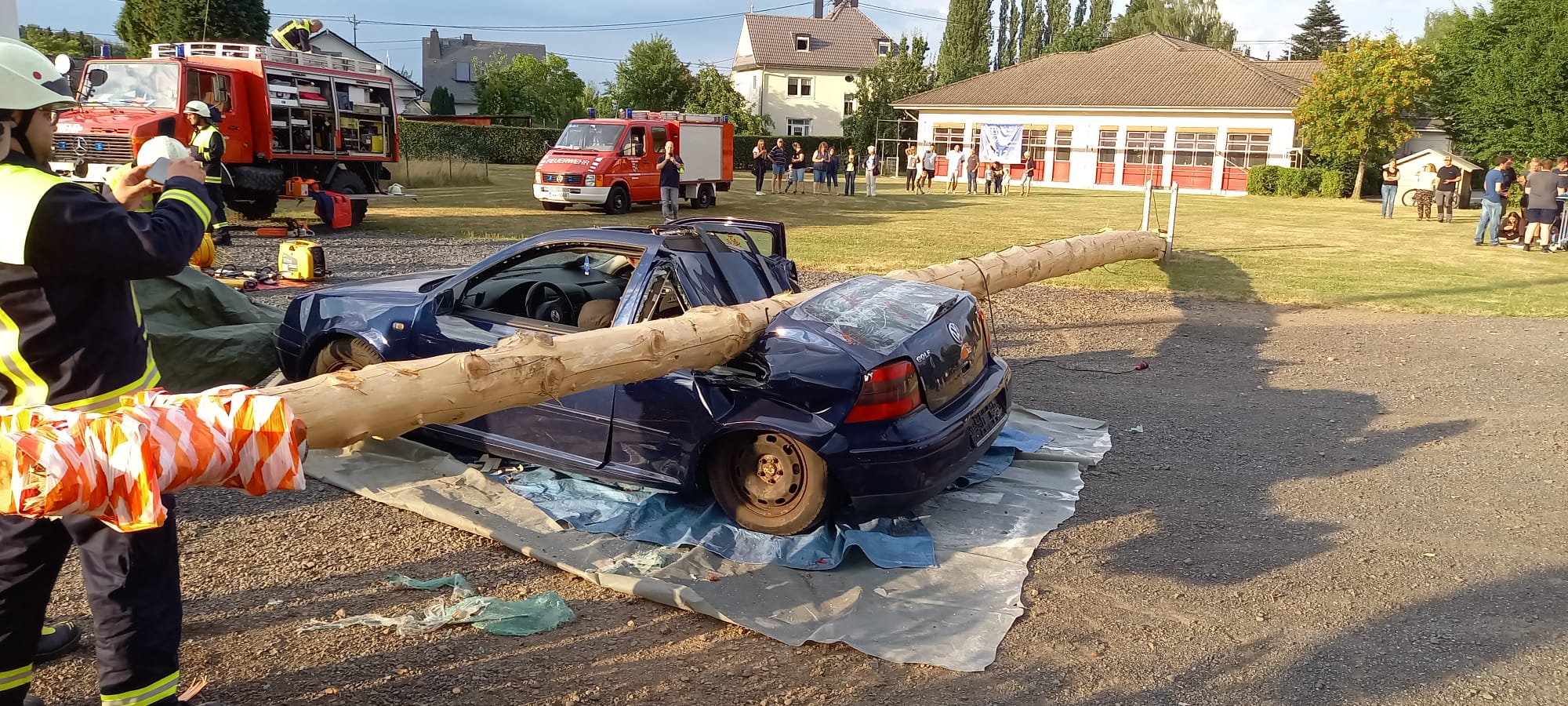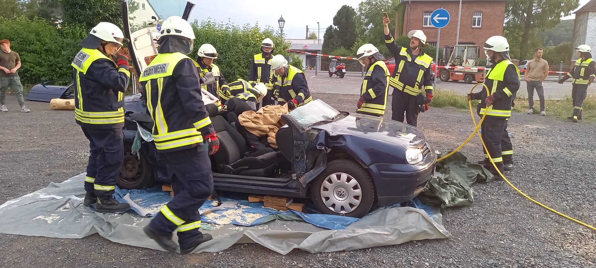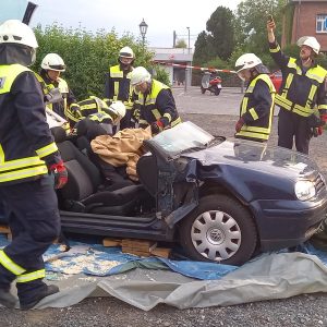 Übung der Feuerwehr: Verkehrsunfall durch Windwurf