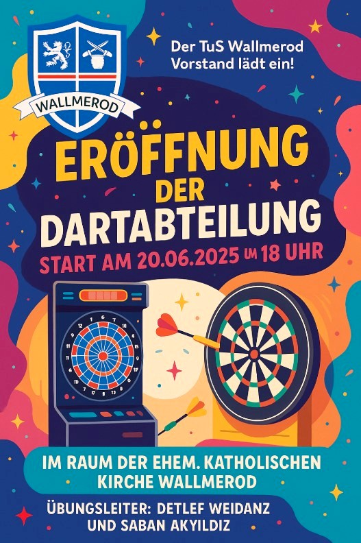 Der TuS Wallmerod eröffnet eine neue Abteilung: Dart. Die neue Abteilung startet am 20.06.2025. Ab 18 Uhr können alle Interessierten und Neugierige im neu hergerichteten Raum unterhalb der ehemaligen Sakristei der kath. Kirche Dart spielen. Der Abend wird gestaltet von Detlef Weidanz und Saban Akyildiz, die sich auf Anfänger und erfahrene Spieler freuen.