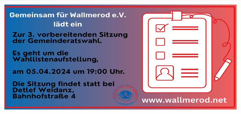 Die GfW lädt alle interessierten Bürger:Innen herzlich ein, sich aktiv an der Gestaltung der Zukunft von Wallmerod zu beteiligen und freut sich auf eine konstruktive Zusammenarbeit. Wir freuen uns auf weitere rege Beteiligung und zahlreiches Erscheinen.