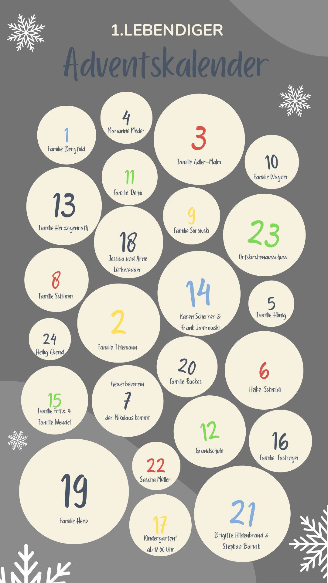 - Um den ersten lebendigen Adventskalender ein bisschen einfacher zu gestalten gibt es zur Orientierung eine digitale Version des Adventskalenders, mit Namen der beteiligten Haushalte.