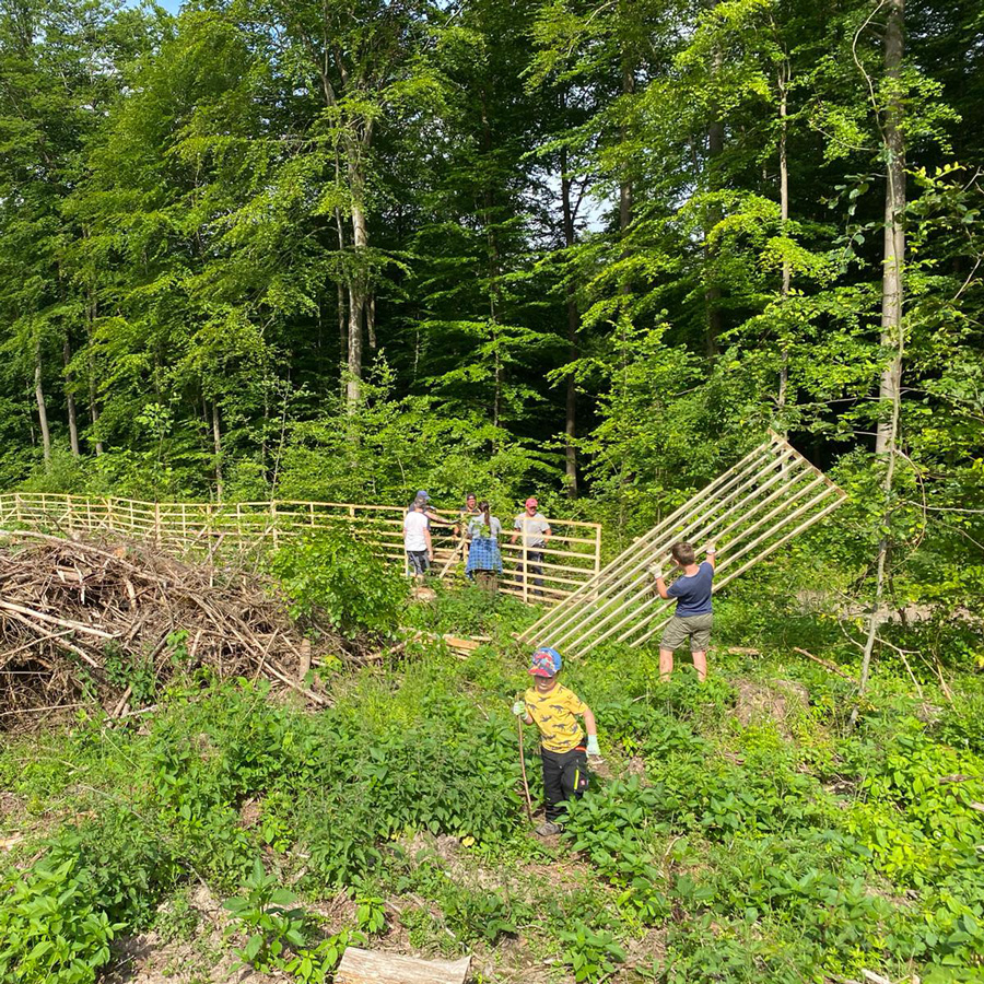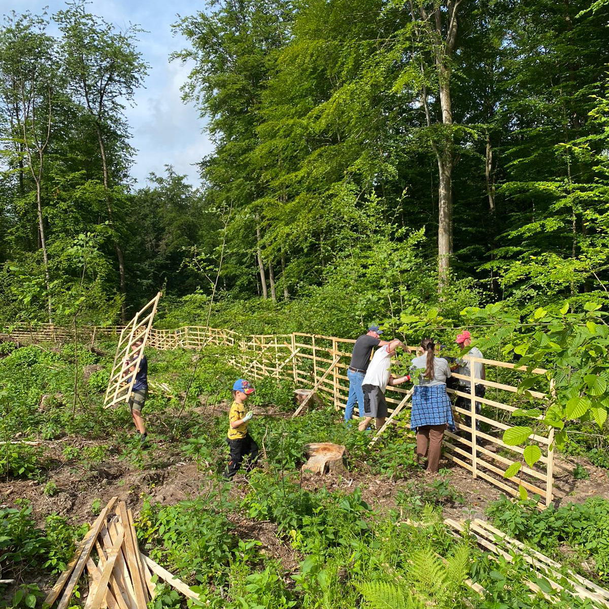 Zum Schutz vor Wildverbiss wurde die Fläche am Samstag dann von Mitgliedern des Gemeinderates und zwei weiteren jungen Freiwilligen mit einem Wildschutzgatter eingezäunt (Hordengatter).